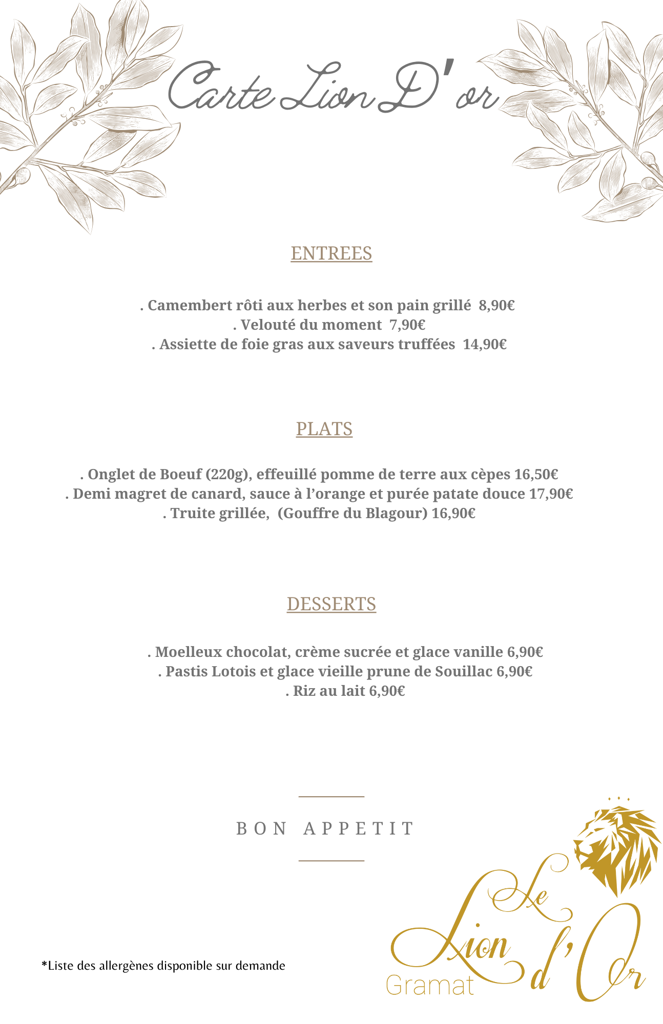 Le Café/Restaurant du Lion d’Or est ouvert du lundi au vendredi de 7h à 14h et de 17h30 à 20h30, fermé le week-end.